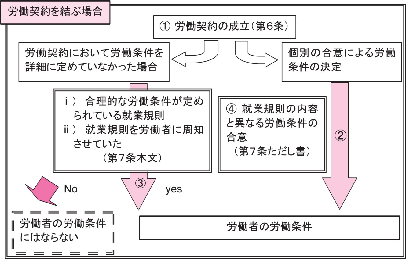 ① 労働契約は、「労働者が使用者に使用されて労働」することと「使用者がこれに対して賃金を支払う」ことについて、労働者と使用者が合意することにより成立します。 ② 労働者と使用者の合意により労働者の労働条件が決定します。 ③ 労働契約において労働条件を詳細に定めずに労働者が就職した場合において、「合理的な労働条件が定められている就業規則」であることに加え、「就業規則を労働者に周知させていた」ことという要件を満たす場合には、労働者の労働条件は、その就業規則に定める労働条件によることとなります。 ④ ただし、「就業規則の内容と異なる労働条件を合意していた部分」は、その合意が優先することとなります(合意の内容が就業規則で定める基準に達しない場合を除きます)。 |