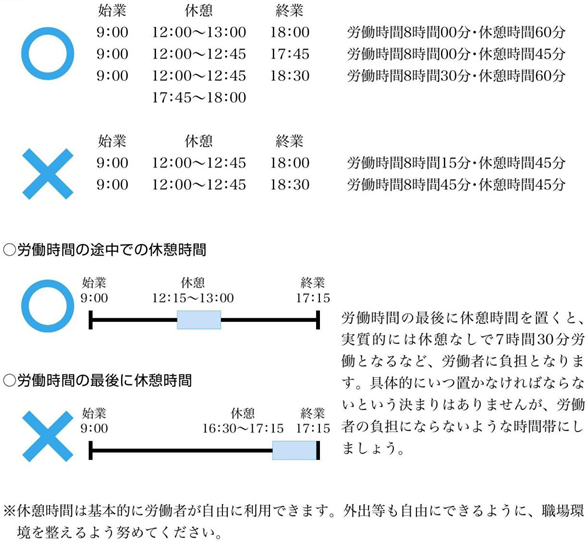 ○ 休憩時間は、①労働時間の途中で、②一斉に与え、③自由に利用させることが原則です。