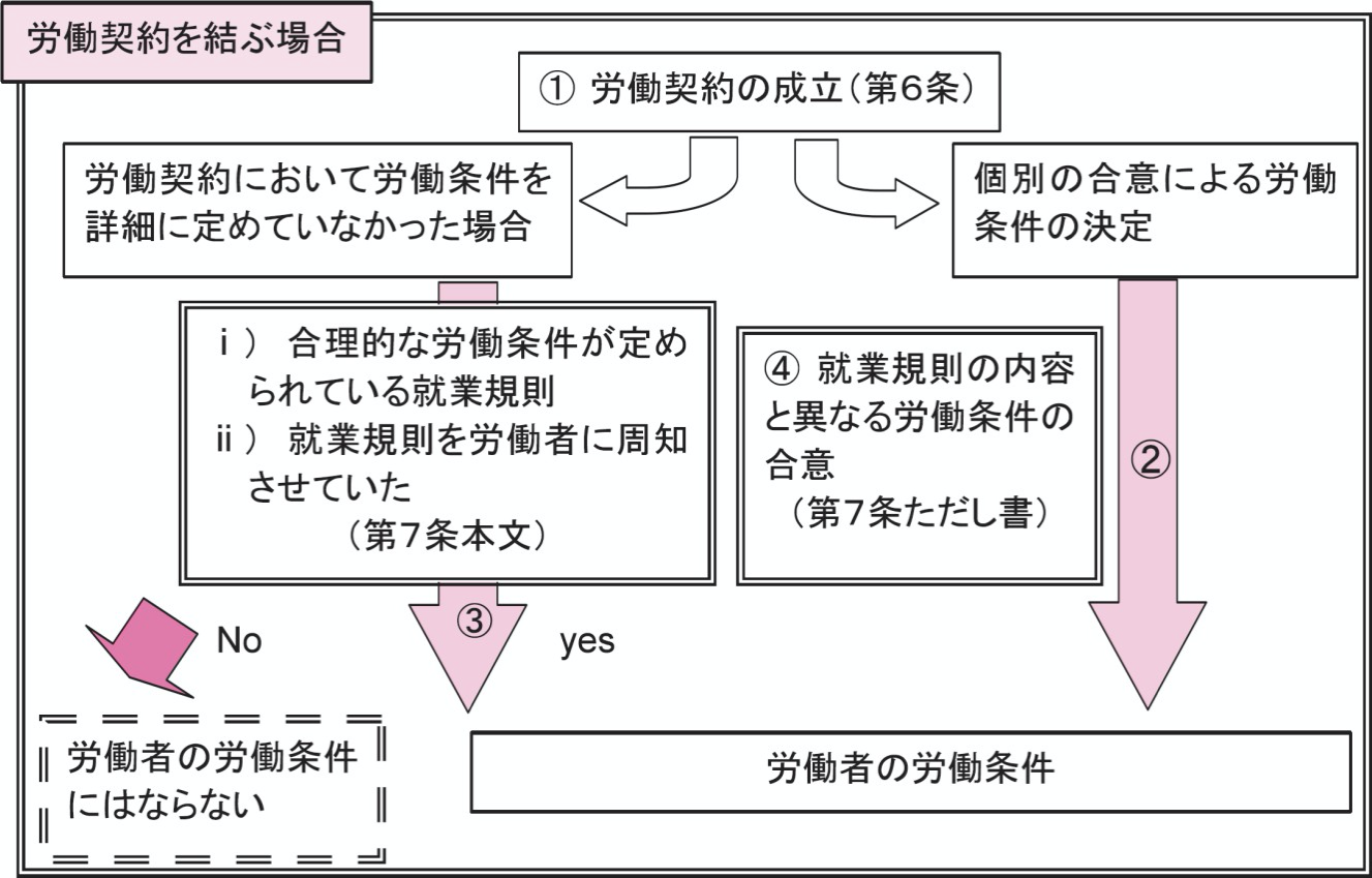 • ③ 労働契約において労働条件を詳細に定めずに労働者が就職した場合において、「合理的な労働条件が定められている就業規則」であることに加え、「就業規則を労働者に周知させていた」ことという要件を満たす場合には、労働者の労働条件は、その就業規則に定める労働条件によることとなります。