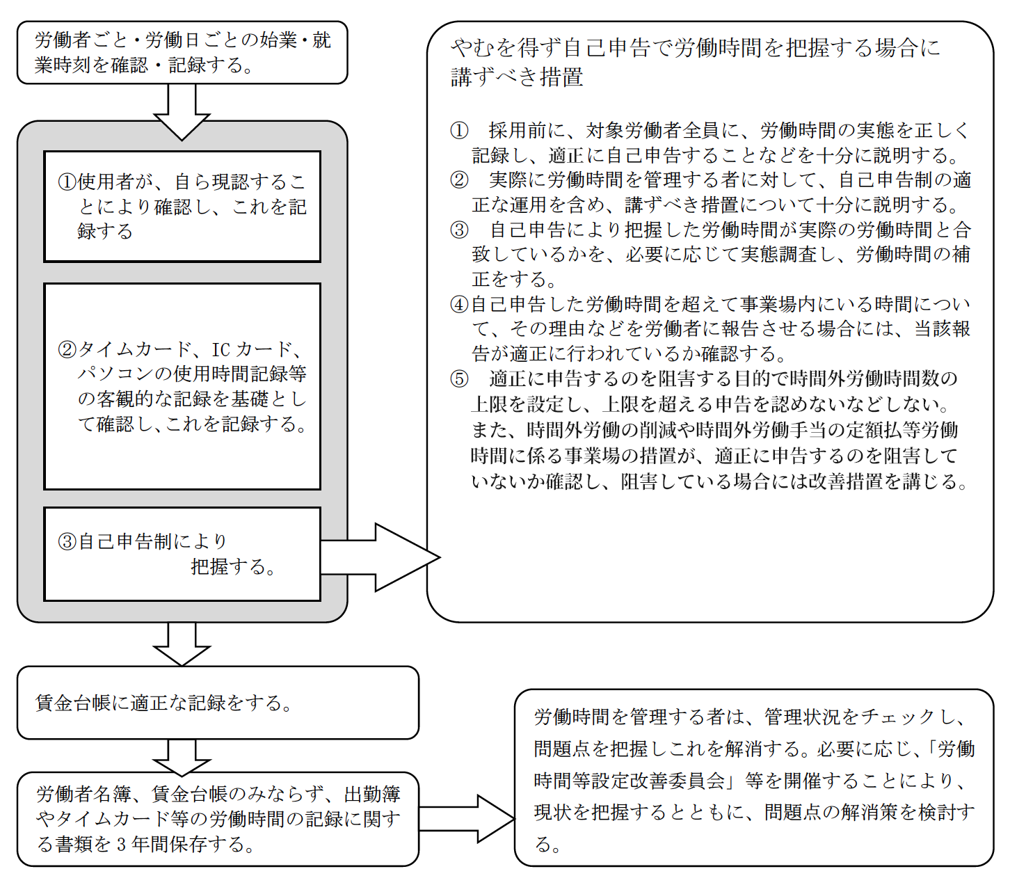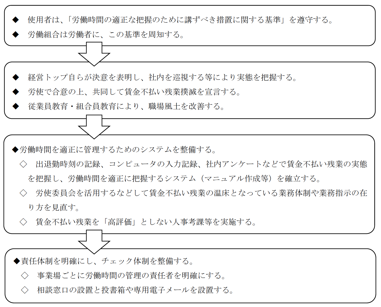 厚生労働省は、賃金不払残業の発生を防ぐためには労働時間を適正に把握することが欠かせないとして、「労働時間の適正な把握のために講ずべき措置に関する基準」(平成 13.4.6 基発第 339 号) を定めました。しかし、賃金不払残業が行われることのない企業となるには、使用者が労働時間を適正に把握するよう努めるだけではなく、管理責任体制を明確化するとともにチェック体制を整備することなどを通じて労働時間を適正に管理するためのシステムを整備するほか、労働時間を適正に管理しようとする職場風土を創り出すことなどに労使が主体的に取り組むことが欠かせません。