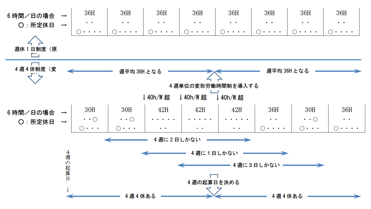 例えば4週4休制で 1 日の所定労働時間を 6 時間と短くしている場合でも、休日のない週は週の所定労働時間が法定労働時間 40 時間を超えることとなります。この超えた時間を時間外労働としないためには、1か月単位の変形労働時間制などを採用する必要があります。