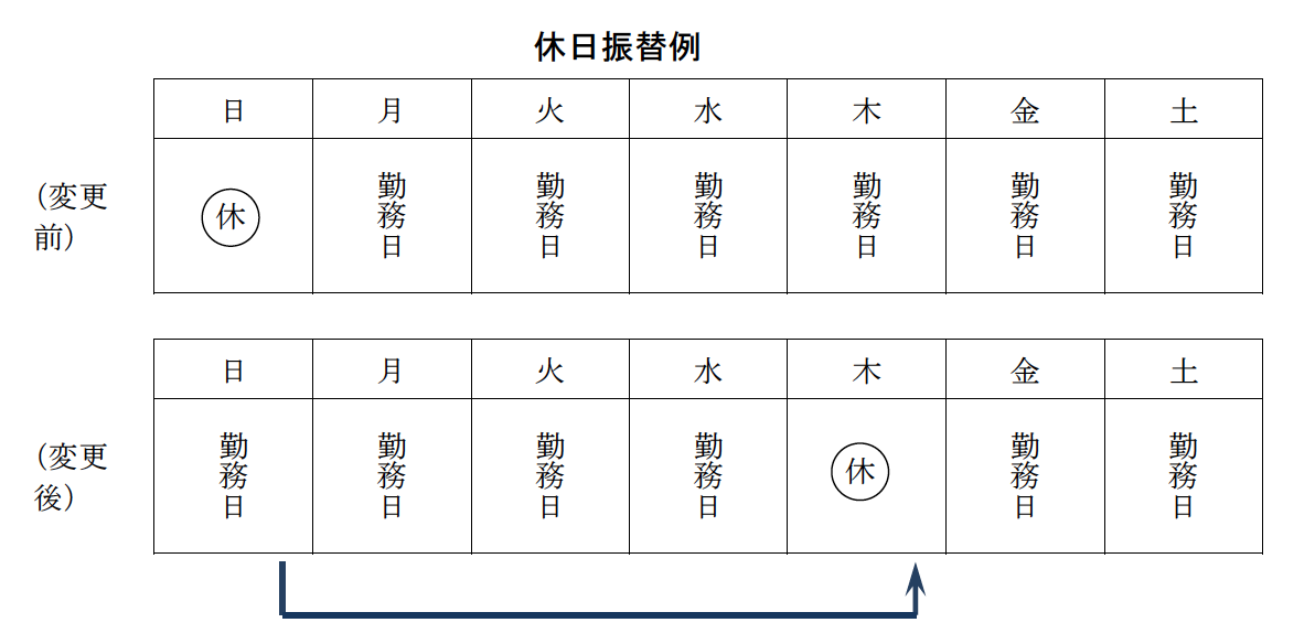 「休日の振替」とは、例えば、次図のように、所定休日である日曜日を勤務日に変更する代わりに、勤務日である木曜日を休日とするように、所定休日と他の勤務日をあらかじめ振り替えることをいいます。