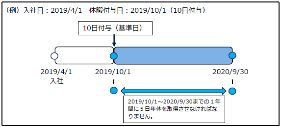 - 使用者は、労働者ごとに、年次有給休暇を付与した日(基準日)から1年以内に5日について、取得時季を指定して年次有給休暇を取得させなければなりません。