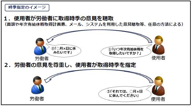 - 使用者は、時季指定に当たっては、労働者の意見を聴取しなければなりません。