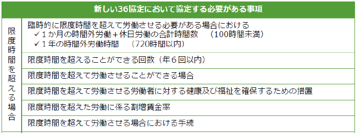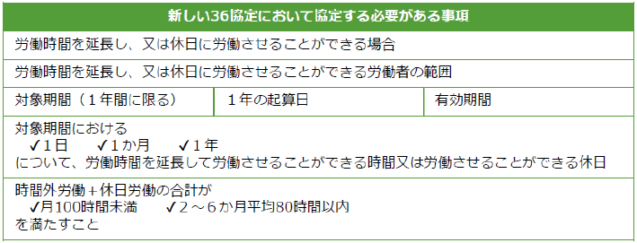 時間外労働又は休日労働を行わせる必要がある場合には、以下の事項について協定した上で、36 協定届(様式第9号)を所轄労働基準監督署長に届け出る必要があります。