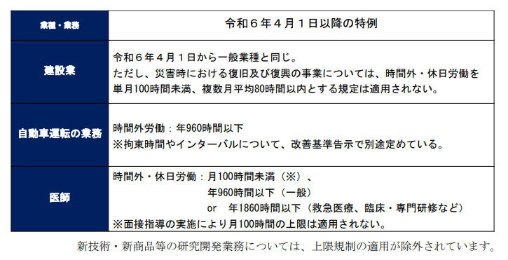 (5)令和6年4月1日から建設の事業、自動車運転の業務、医師についても、時間外労働の上限規制が以下の特例つきで適用されています。