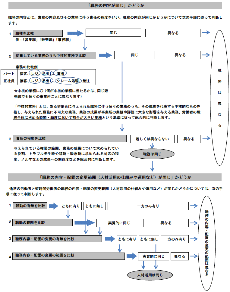 通常の労働者に対して利用の機会を与えている福利厚生施設(給食施設、休憩室、更衣室)については、パートタイム・有期雇用労働者に対しても利用の機会を与えることが義務付けられています(パート・有期法 12)。例えば、定員の関係で給食施設を事務所の労働者全員が利用できないような場合に、増築などをして全員に利用の機会を与えることまで求めるものではありませんが、通常の労働者と同じ利用規程を適用したり、利用時間に幅を設けたりするなどにより、すべてのパートタイム・有期雇用労働者が利用出来るようにすることが求められます。パート・有期法上の各規定を適用する場合は、通常の労働者とパートタイム・有期雇用労働者の「職務の内容が同じ」かどうか及び「職務の内容・配置の変更の範囲(人材活用の仕組みや運用など)が同じ」かどうかがポイントとなりますので、次の表を参考としてください。