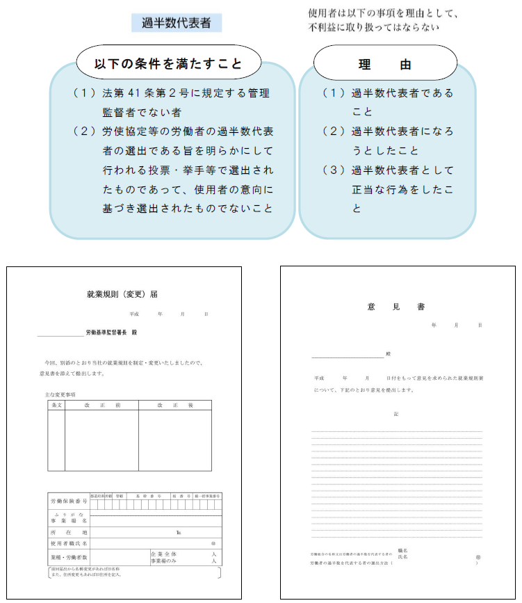 意見を聴く労働者代表とは、事業場の過半数で組織する労働組合があればその労働組合、そのような労働組合がなければ事業場のパートタイム労働者やアルバイト等を含む全労働者の過半数を代表する者のことです。事業場に労働者の過半数で組織する労働組合がない場合の「労働者の過半数を代表する者」の選出の条件等は次の図のとおりです。