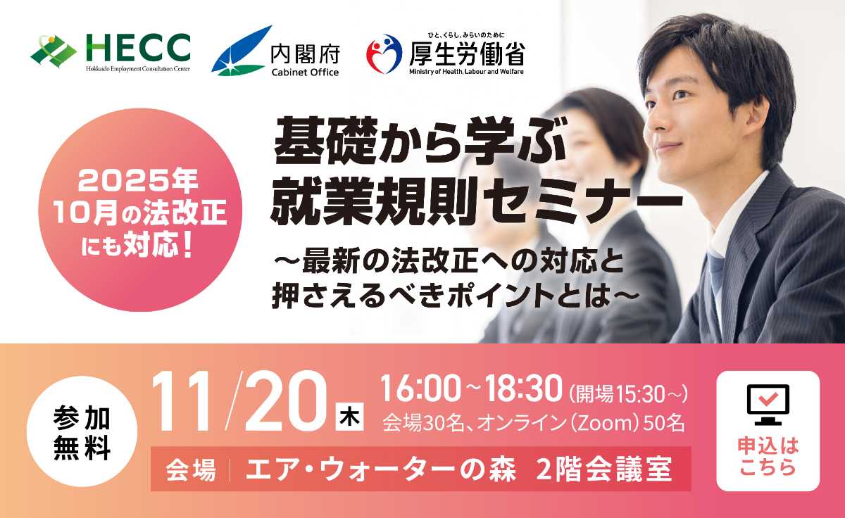 HOME セミナー セミナー 【受付終了】基礎から学ぶ就業規則セミナー~最新の法改正への対応と押さえるべきポイントとは~