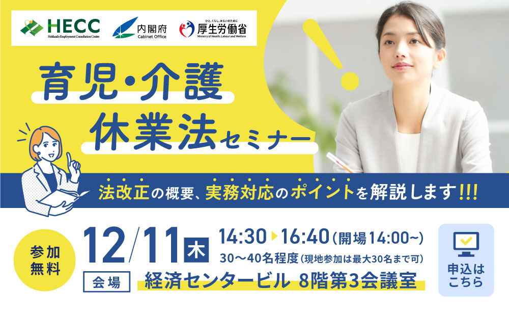 当セミナーでは、労務・人事担当者が知っておきたい“育児・介護休業法” を中心に事例や対策を解説いたします!